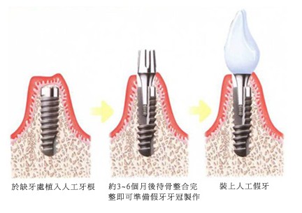 1.將植體(人工牙根)植入缺牙處的齒槽骨中,用來代替已拔除的牙根,