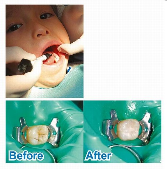 另外,當2至3歲乳臼齒長出後,就可藉由雷射溝隙封填達到預防蛀牙的效果,其原理是先用雷射光纖對水分與蛀牙有氣化蒸發的作用,儘可能將乳臼齒溝隙中的蛀牙結構徹底清除,並填補上一層流動樹脂可強化琺瑯質的表面,每顆乳臼齒自費約800~1500元,一次填補8顆,通常可維持02∼3年左右。