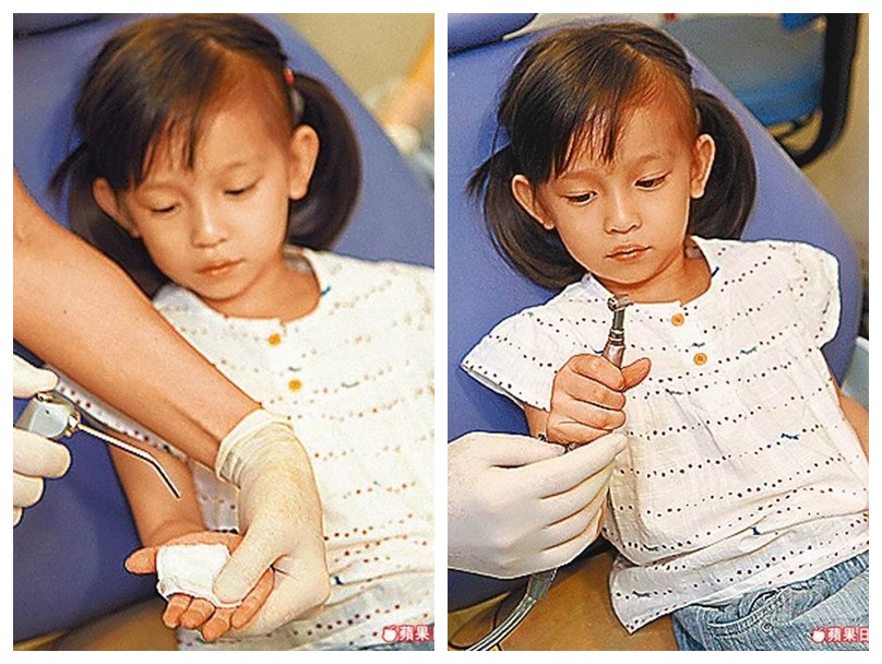 兒童牙科醫師帶小朋友認識器具,減少排斥感。試著讓小朋友手握牙科醫療器材,有助消除恐懼。
